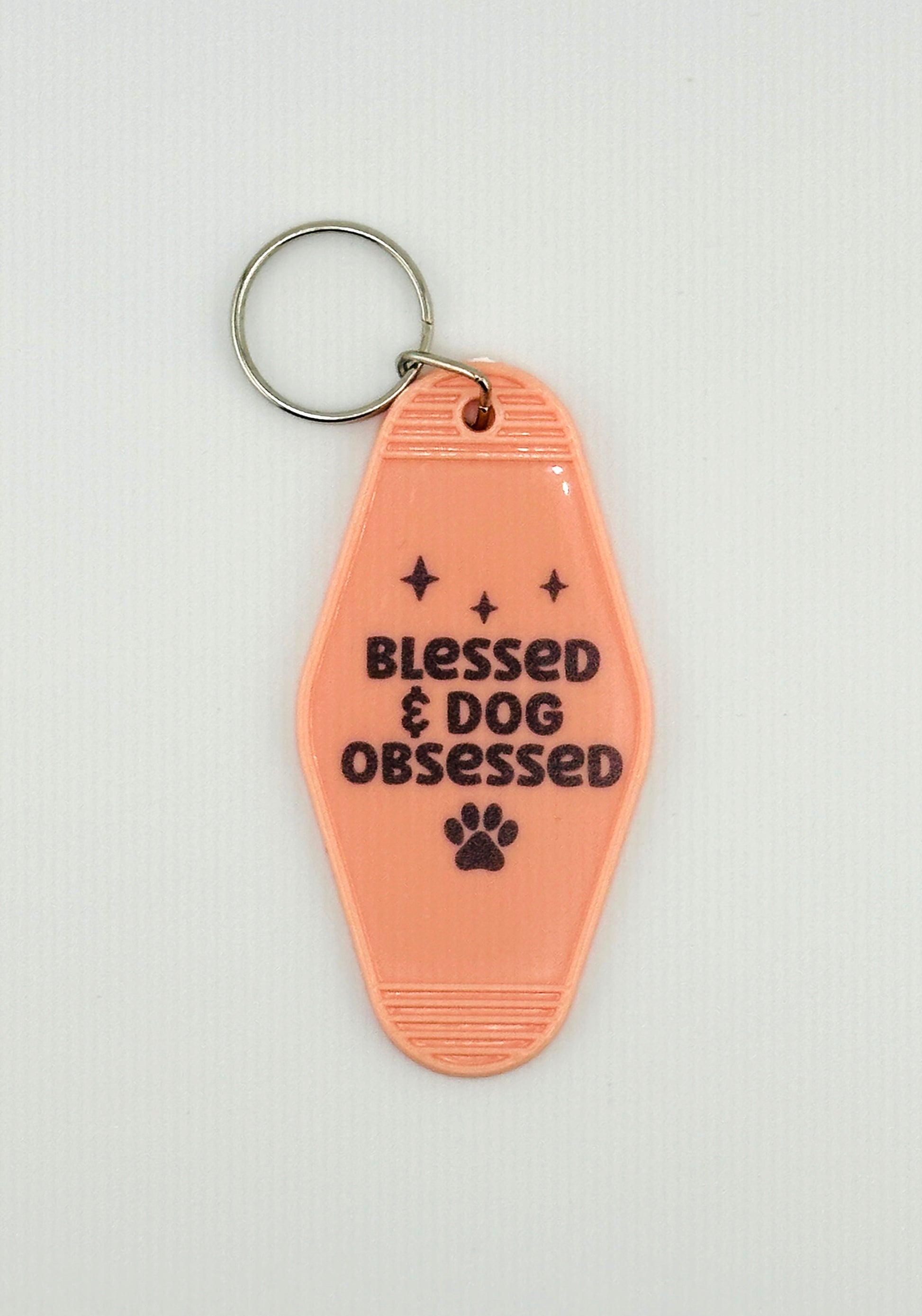Carry your love for dogs everywhere with this charming motel-style keychain. Featuring the playful phrase "Blessed & Dog Obsessed," it's the perfect accessory for dog lovers who wear their passion proudly.