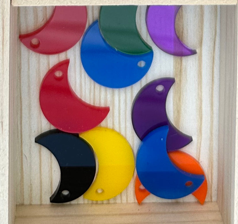 Get ready to howl at the moon with our Crescent Moon Dog Charm! Made from lightweight, laser cut acrylic, this colorful charm features both a crescent moon and an adorable dog design. Perfect for adding a bit of playfulness to any accessory. Woof!