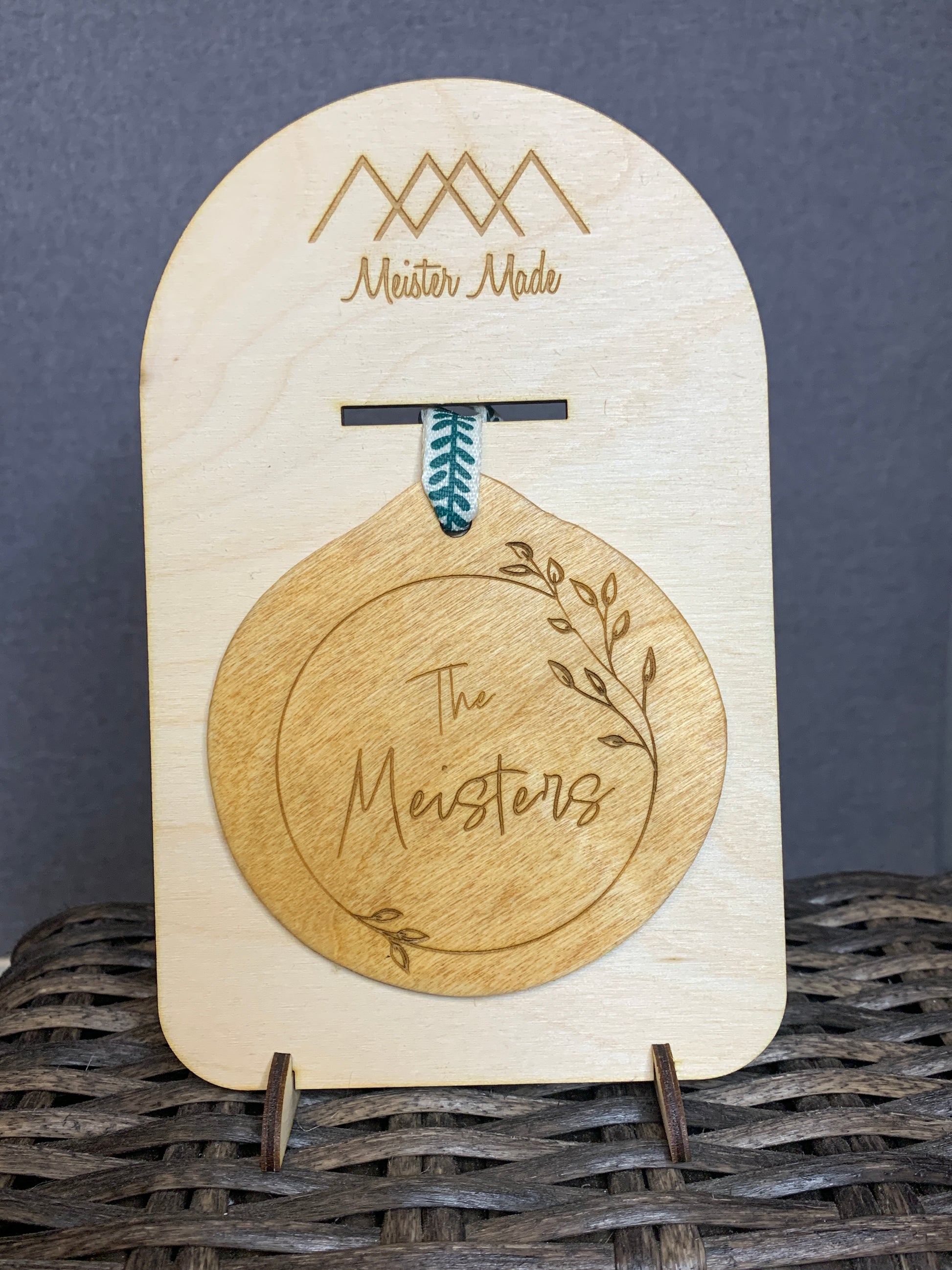 Custom laser engraved wood ornament with leafy wreath and custom name engraved.