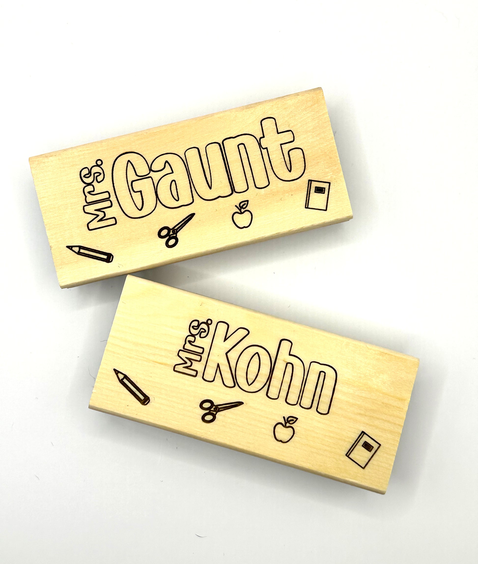 Each eraser is topped with pine wood, custom laser engraved with your selected name and design.
