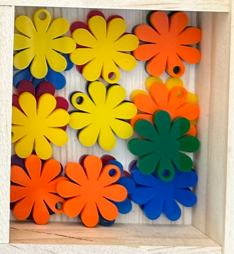 Add a groovy touch to your dog's collar with this Flower Dog Charm! Made with laser cut acrylic, this charm is lightweight and colorful, providing a fun and unique accessory for your furry friend. A playful addition to any dog's look.