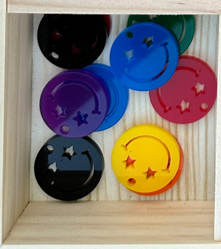 Add some joy and personality to your furry friend's collar with our Happy Face Star Eyes Dog Charm! Made of laser cut acrylic, this lightweight charm features a colorful happy face with star eyes. Let your pup's unique style shine! (Woof-tastic!)
