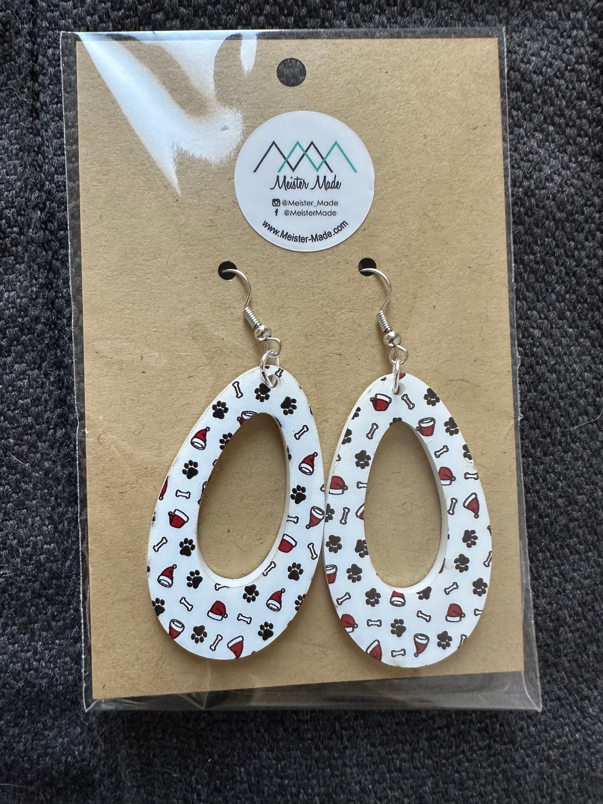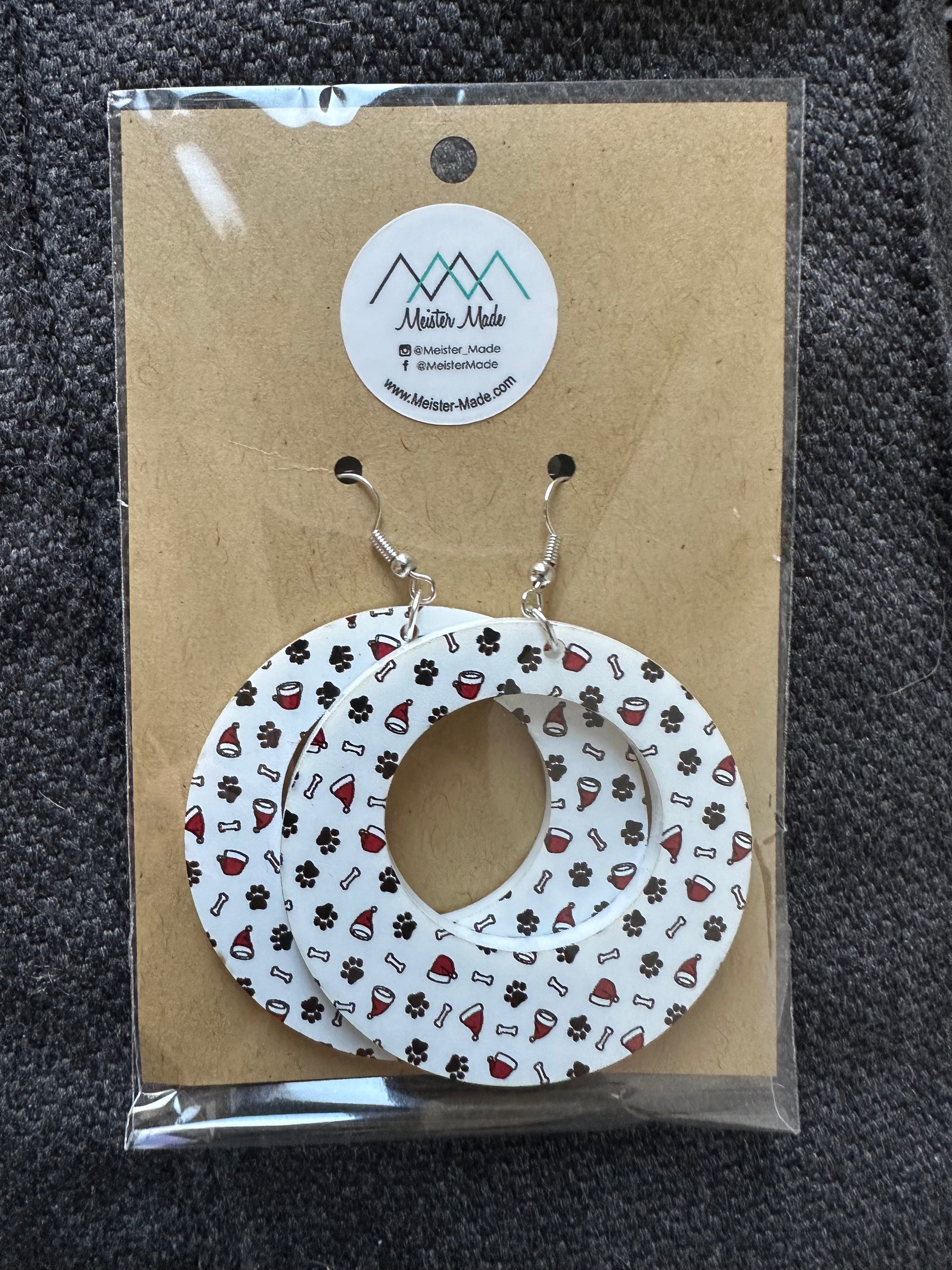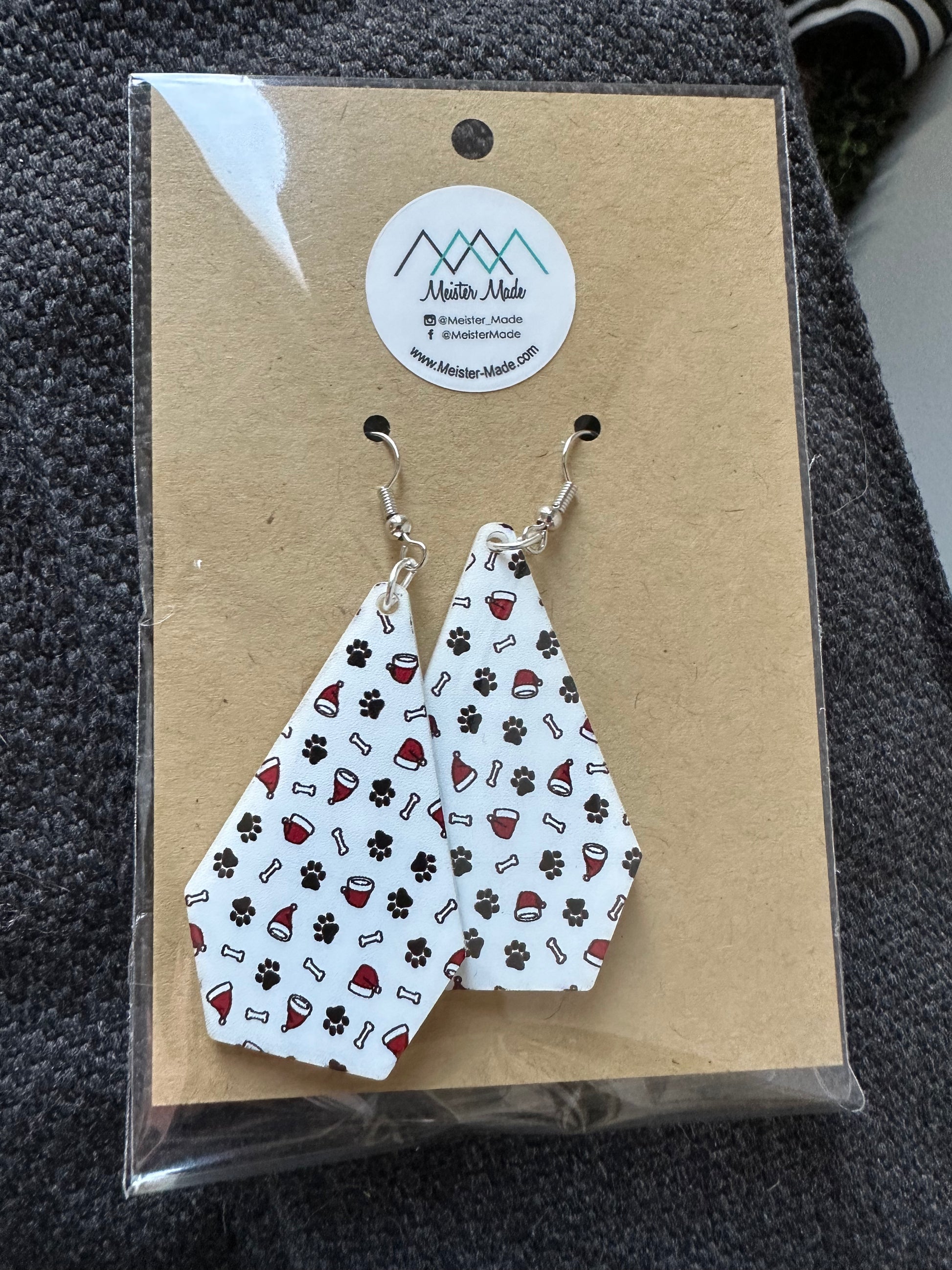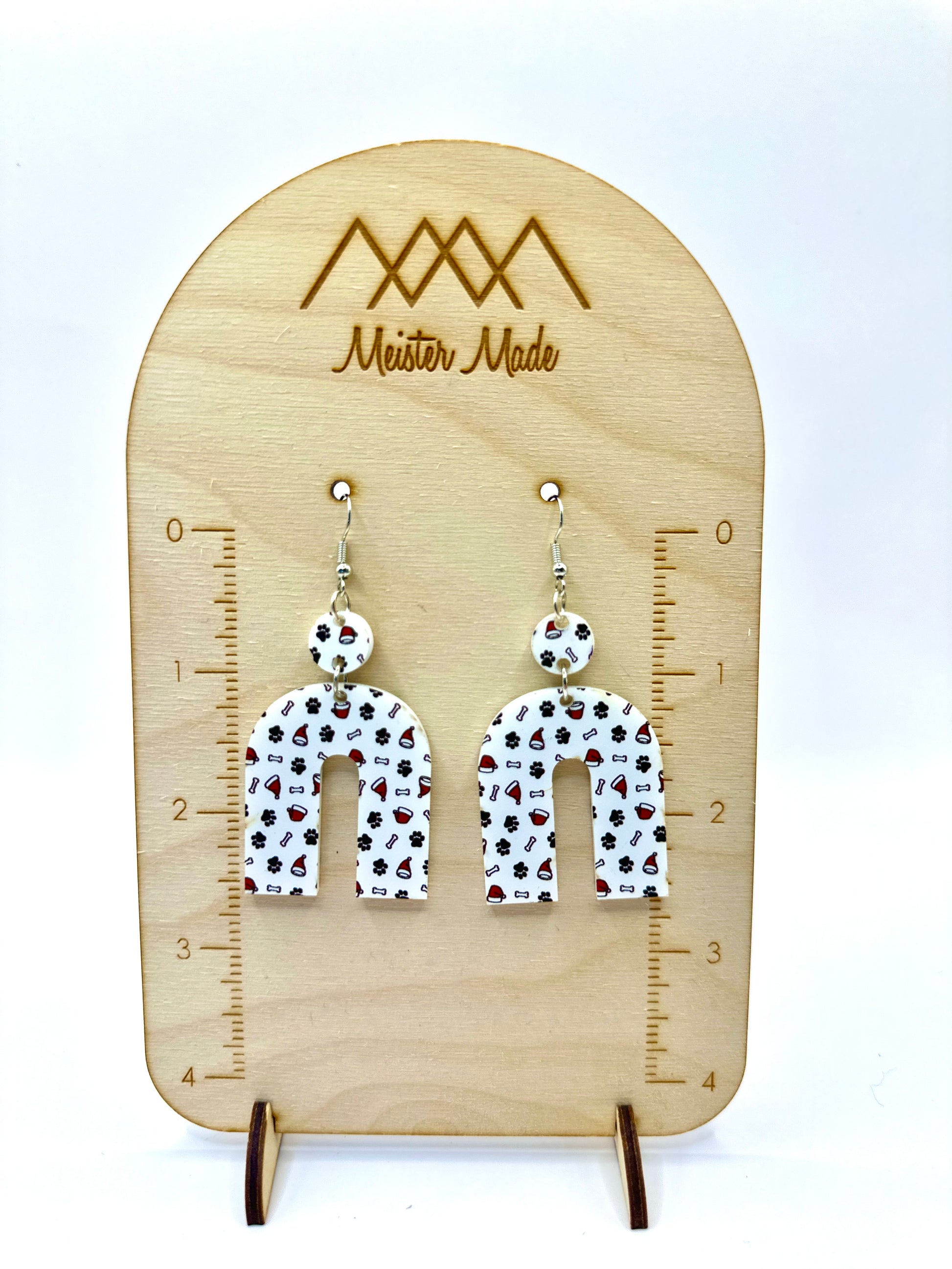 One set of acrylic earrings in the shape of your choice. Each earring is is white with tiny dog bones, Santa hats, and paw prints. Earrings are stainless hooks.