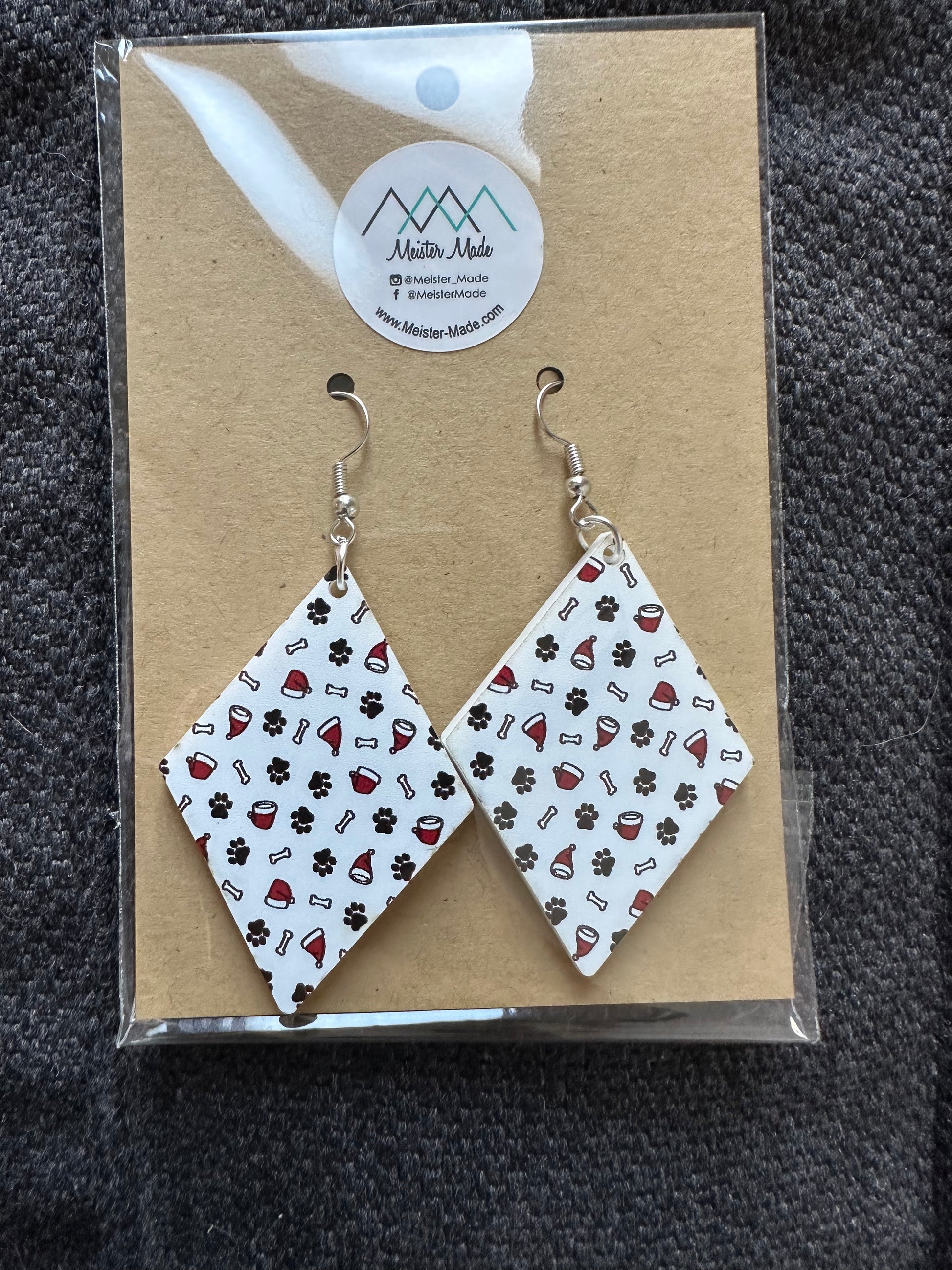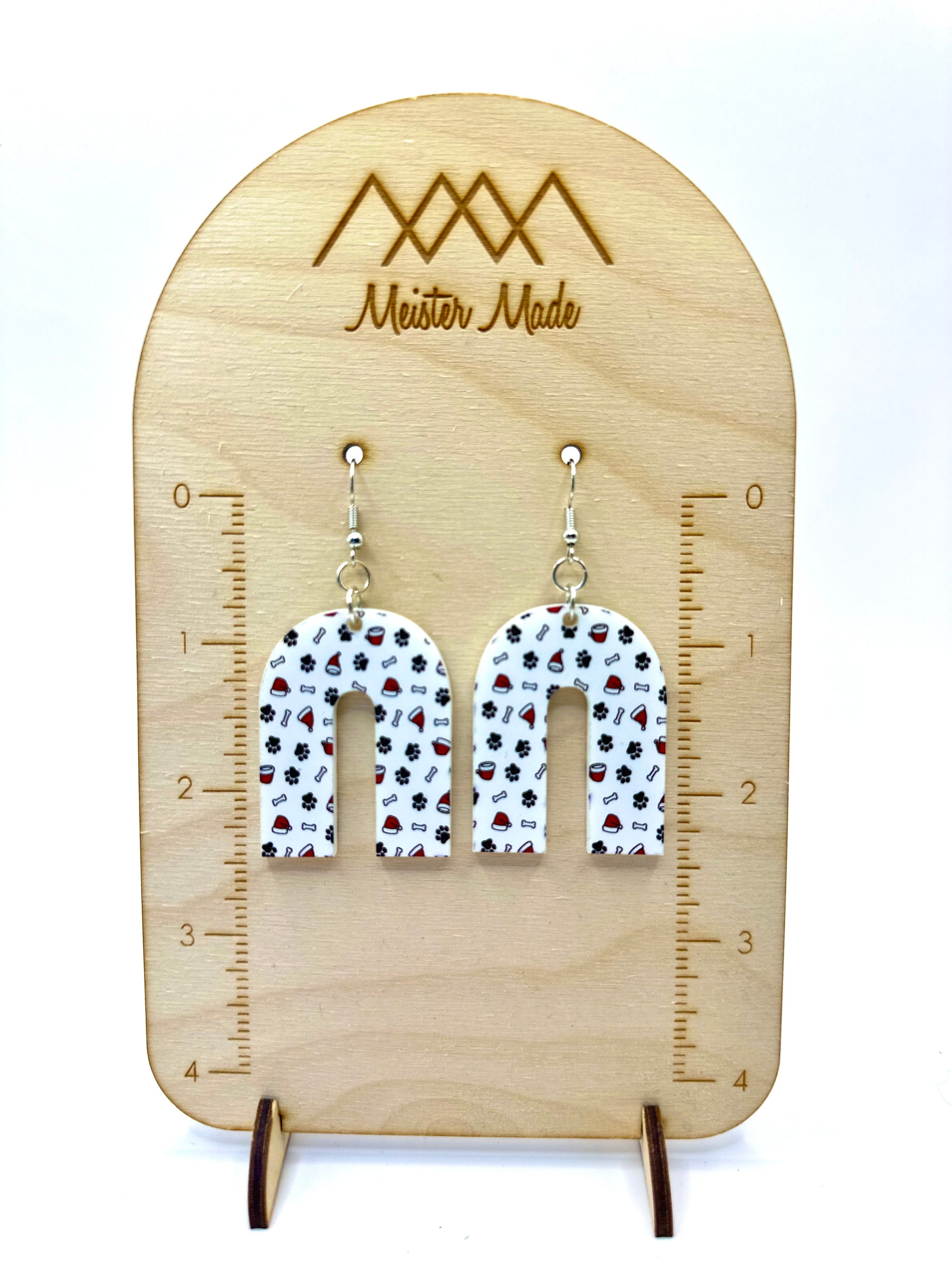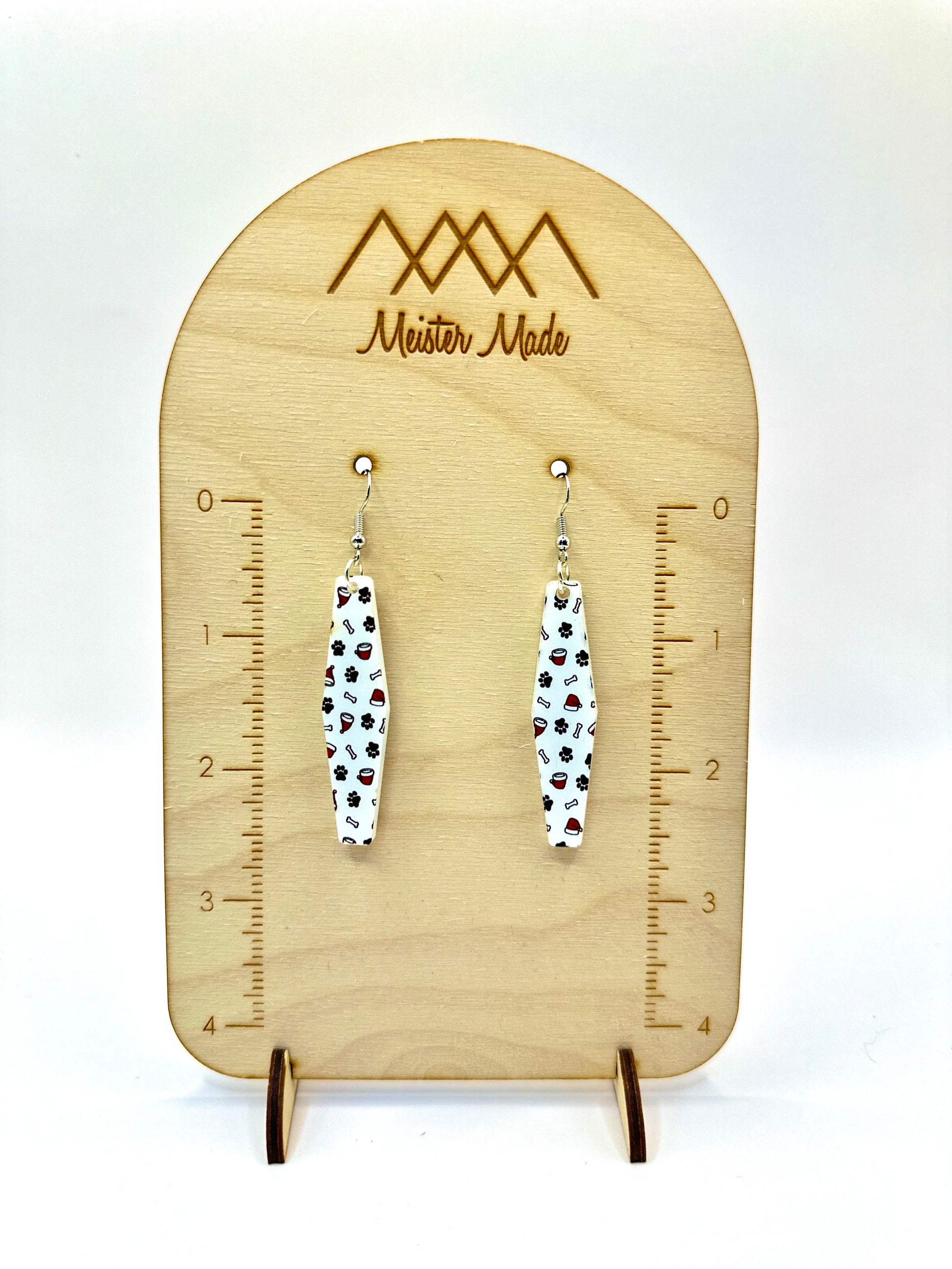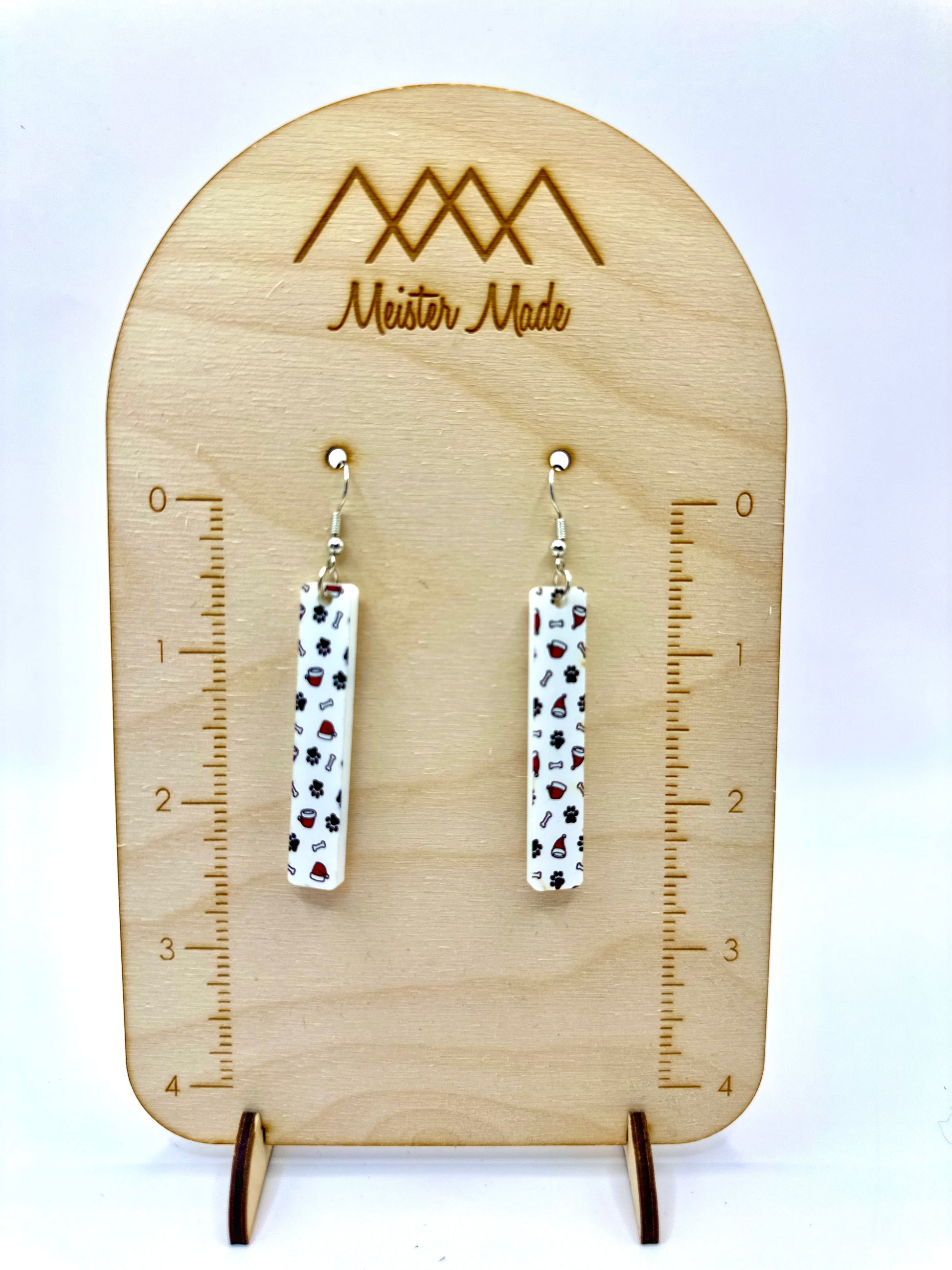 One set of acrylic earrings in the shape of your choice. Each earring is is white with tiny dog bones, Santa hats, and paw prints. Earrings are stainless hooks.
