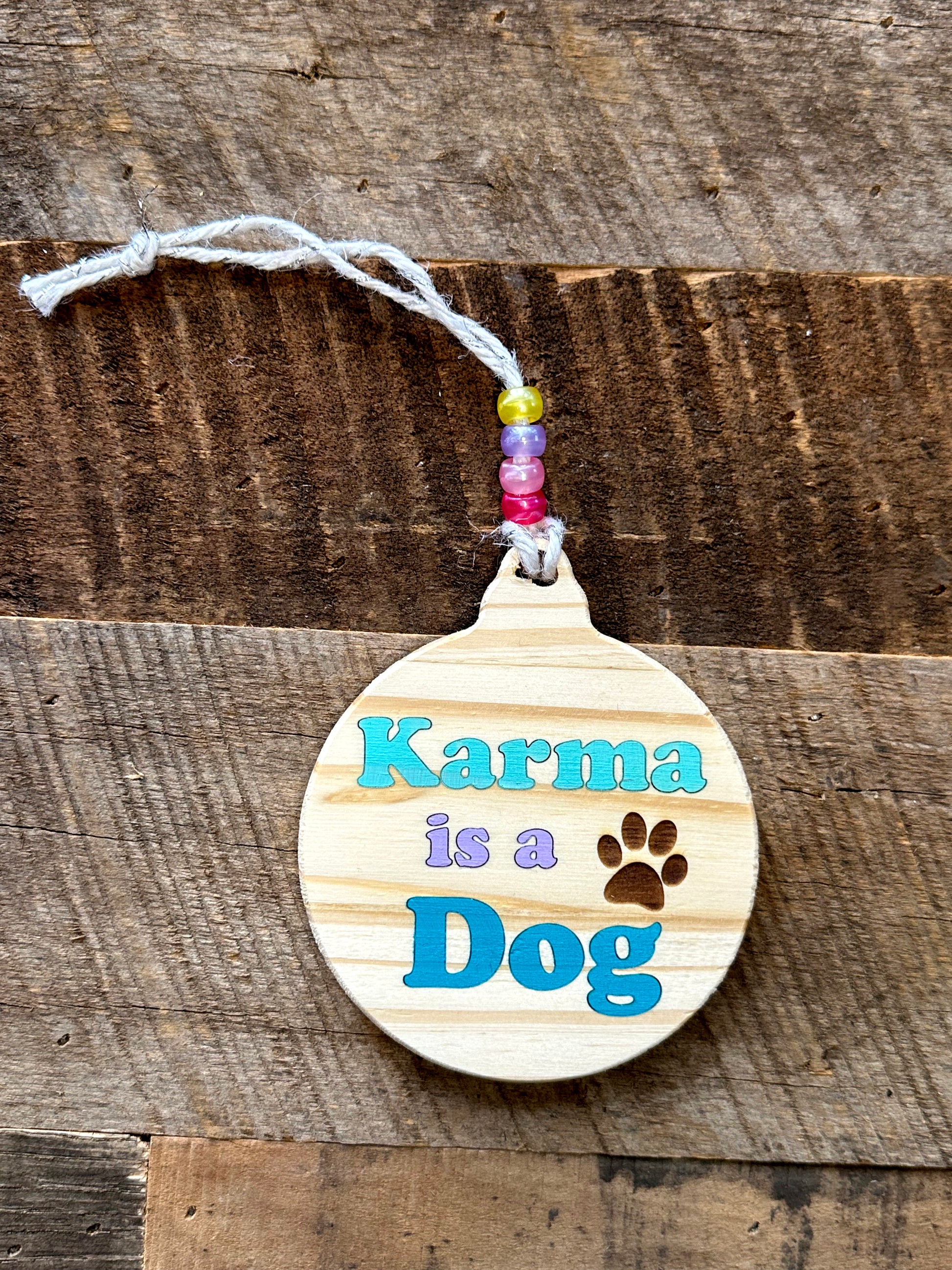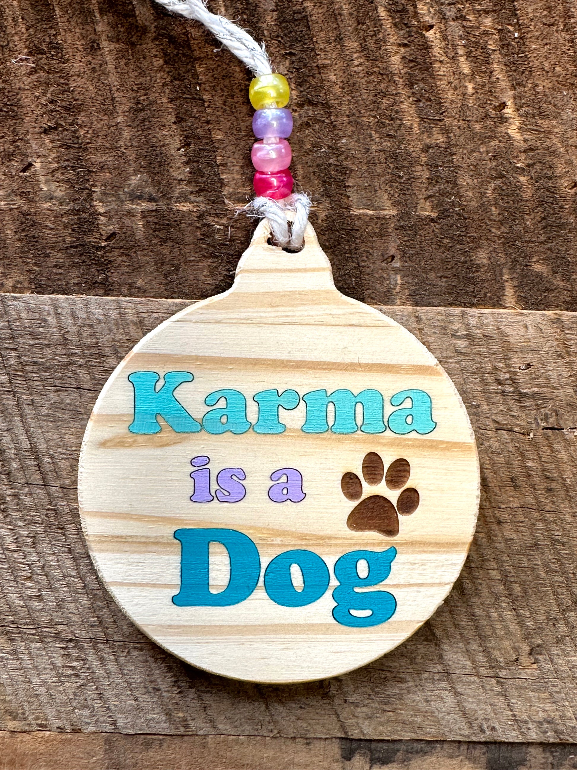Decorate your home with a twist on your favorite Taylor Swift lyrics with this unique and playful laser engraved "Karma Is a Dog" wood ornament. Suspended with colorful beads and a jute string hanger, it's the paw-fect way to add a hint of humor and Swiftie spirit to your décor for the holidays or any days!
