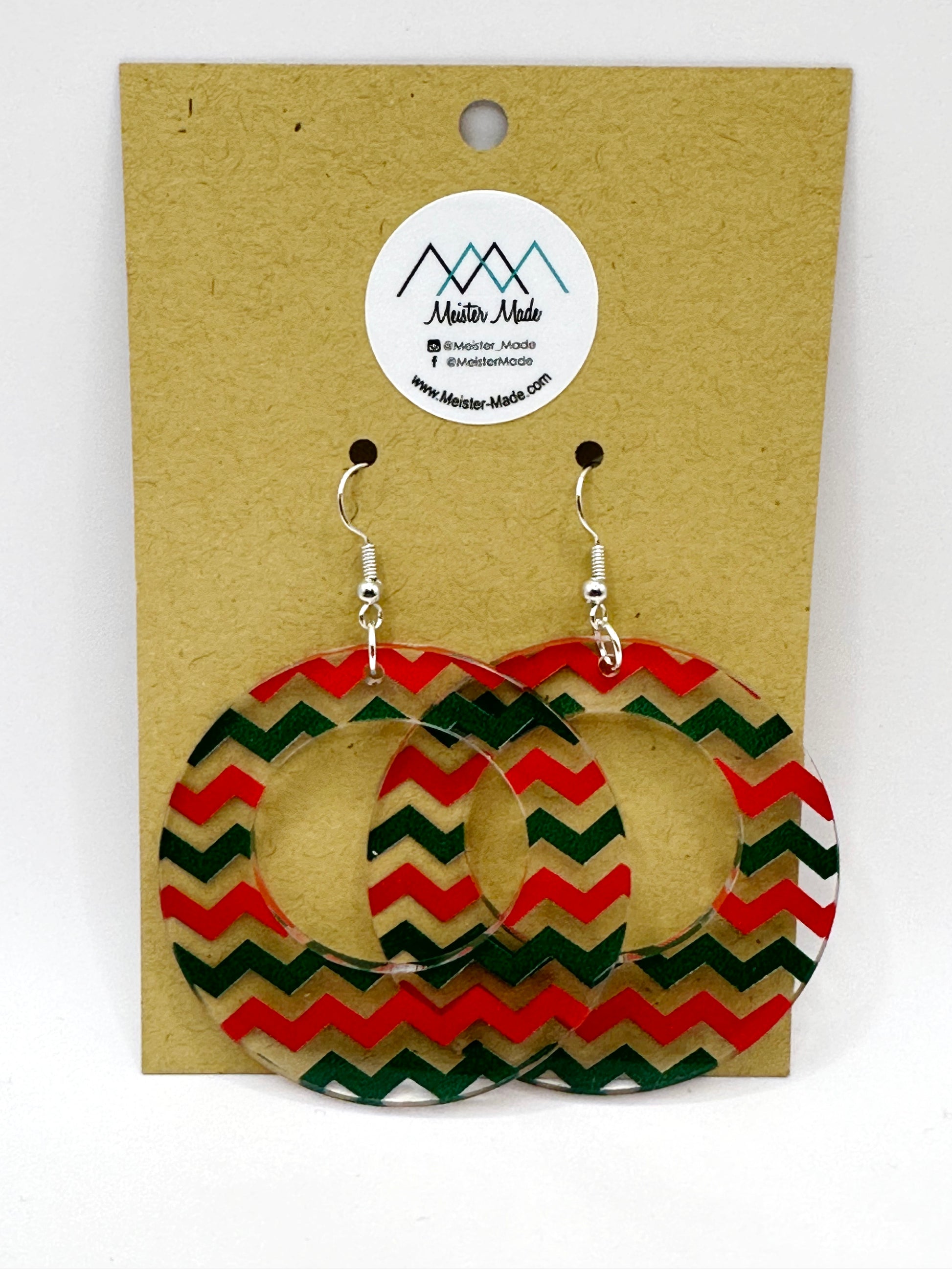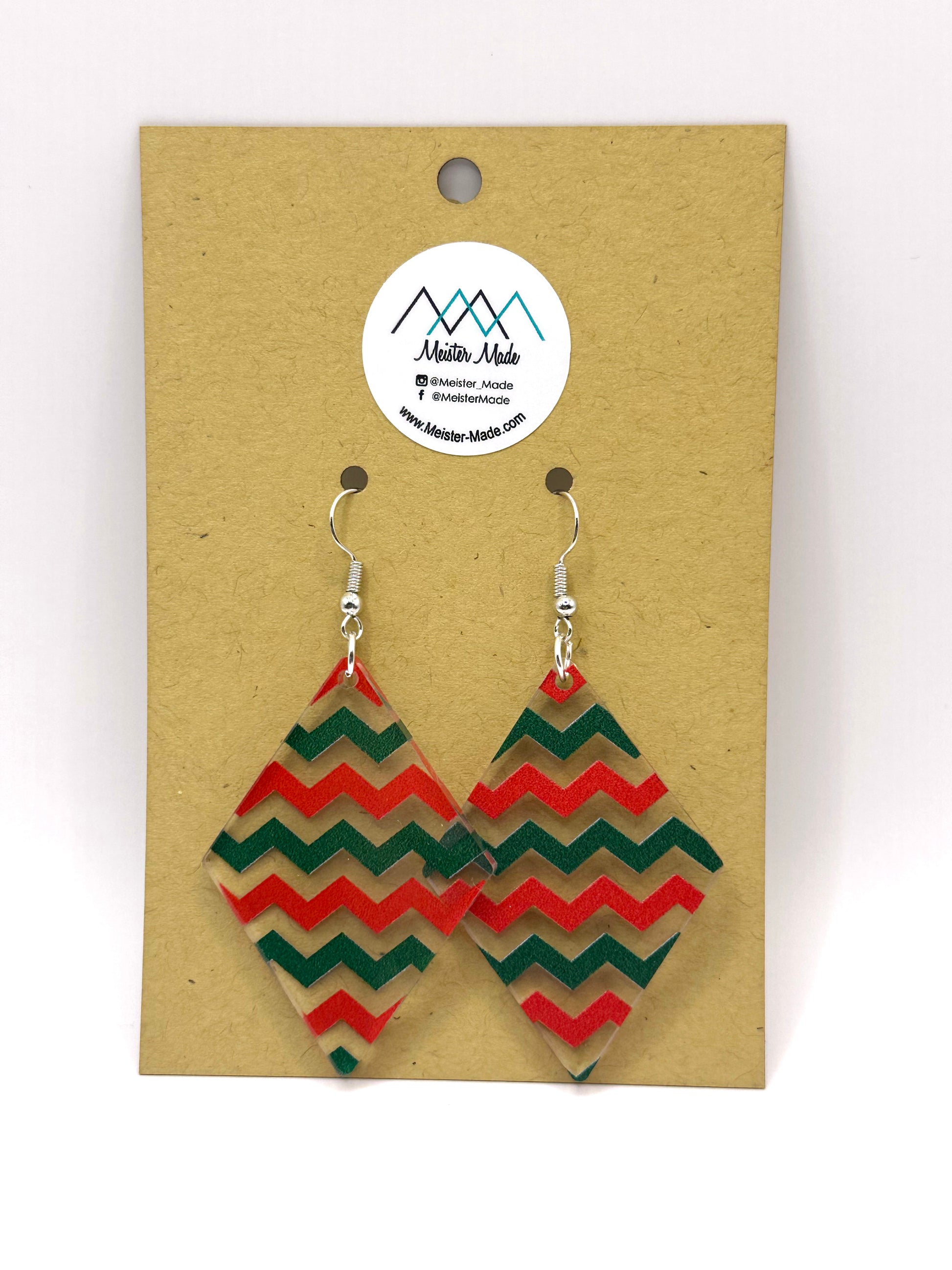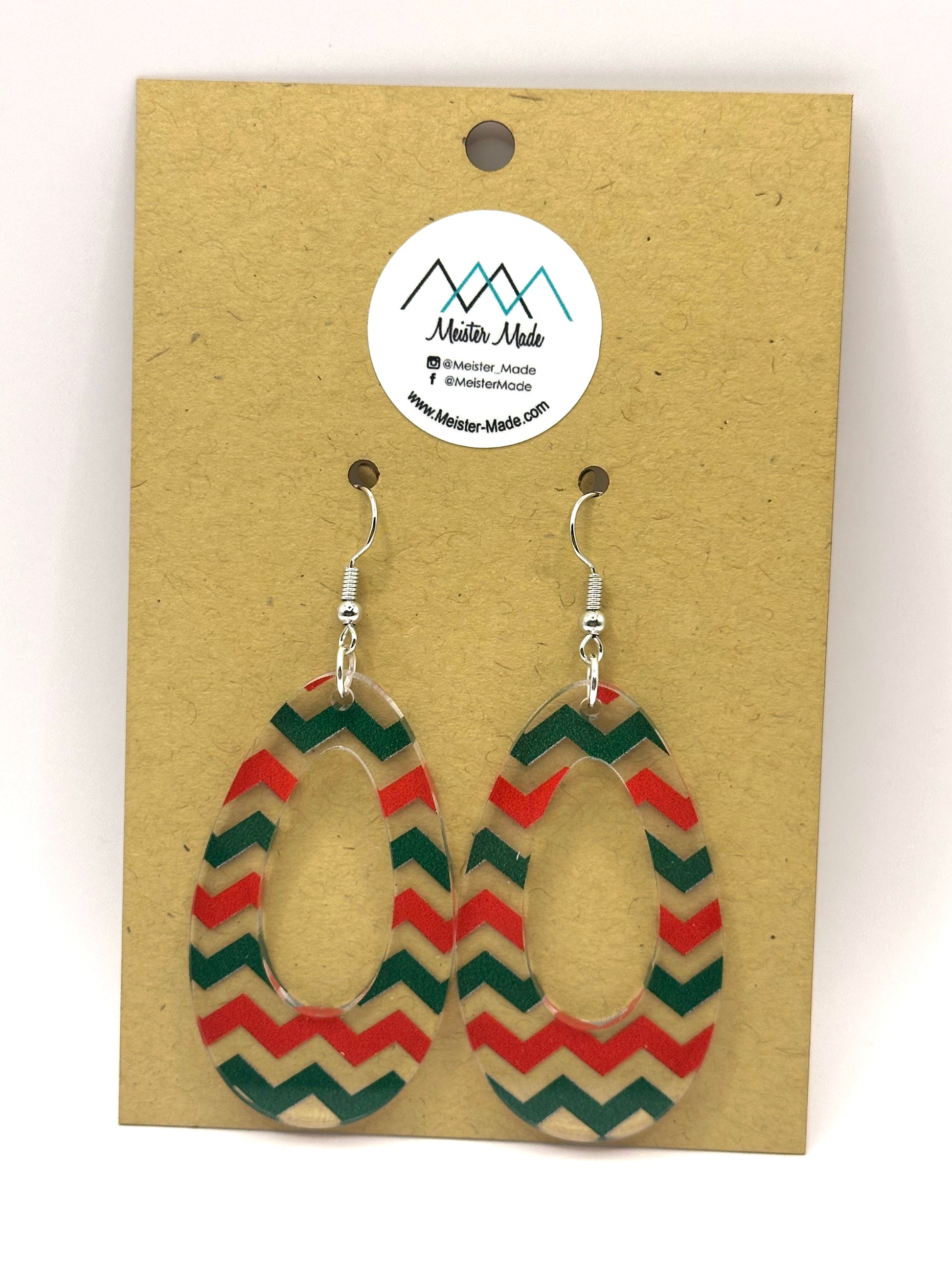 One set of acrylic earrings in the shape of your choice. Each earring is transparent with red & green zigzags. Earrings are stainless hooks.