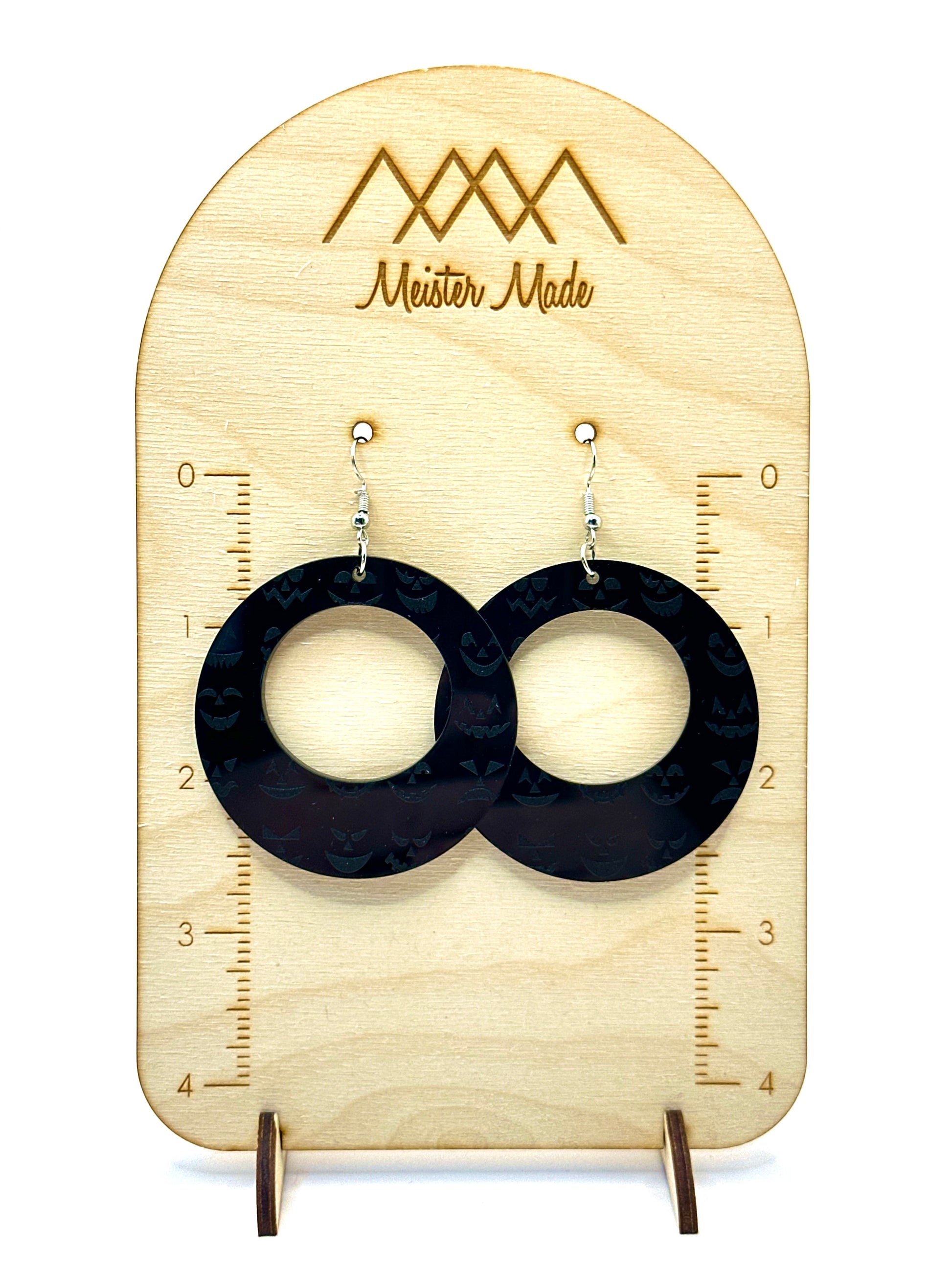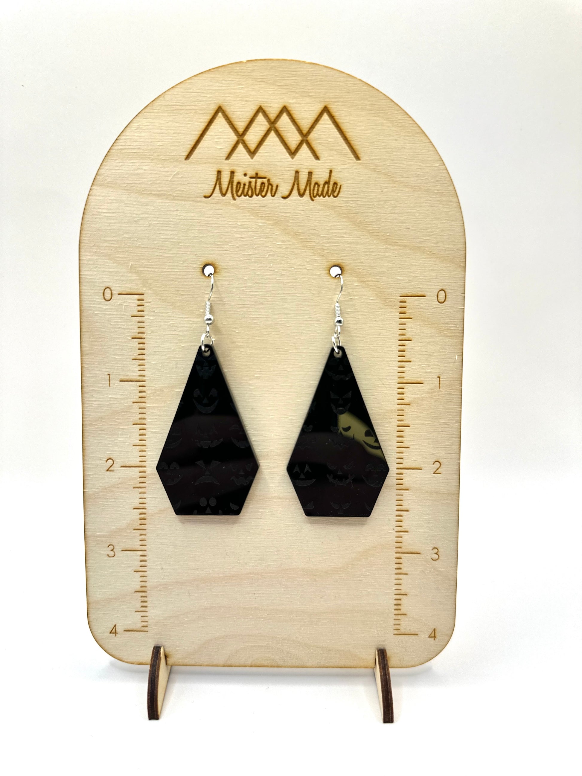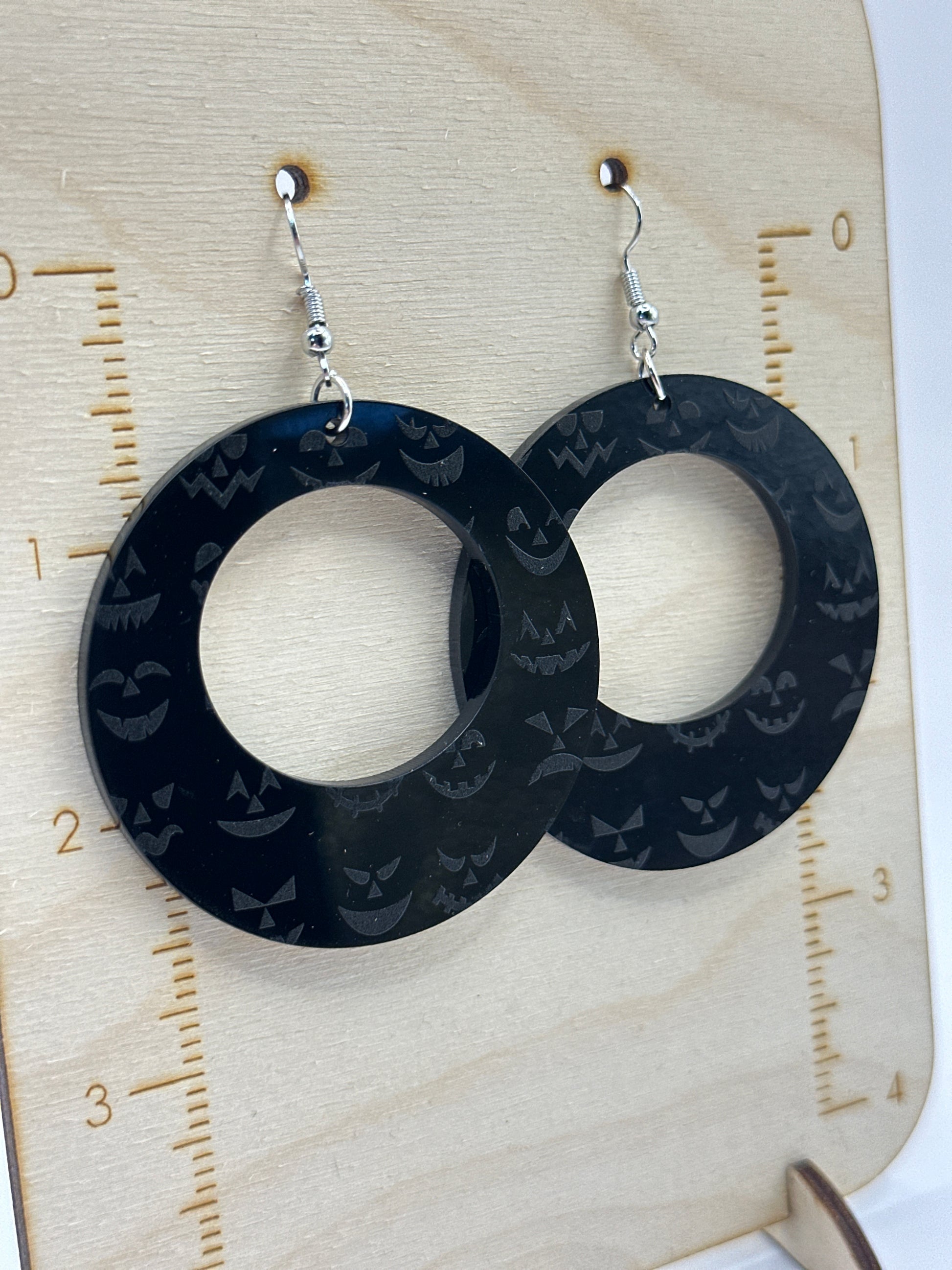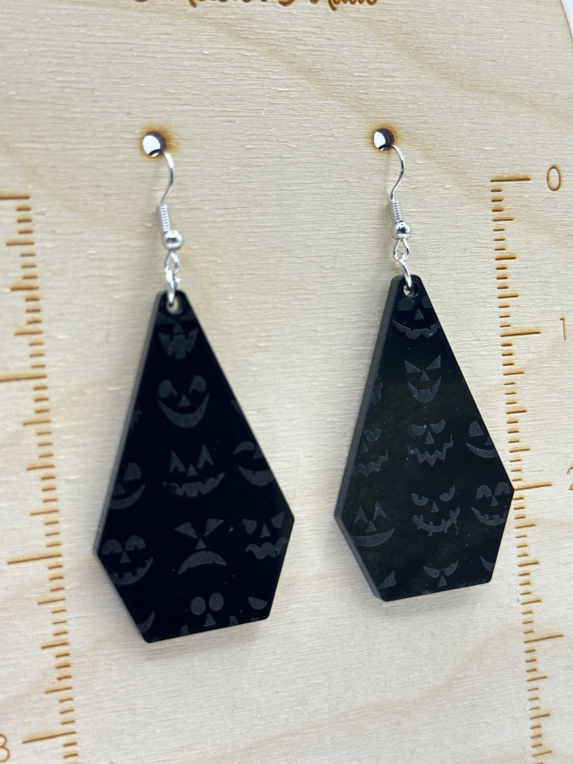 One set of acrylic earrings in the shape of your choice. Each earring is black with black spooky faces printed on them. Earrings are stainless hooks.