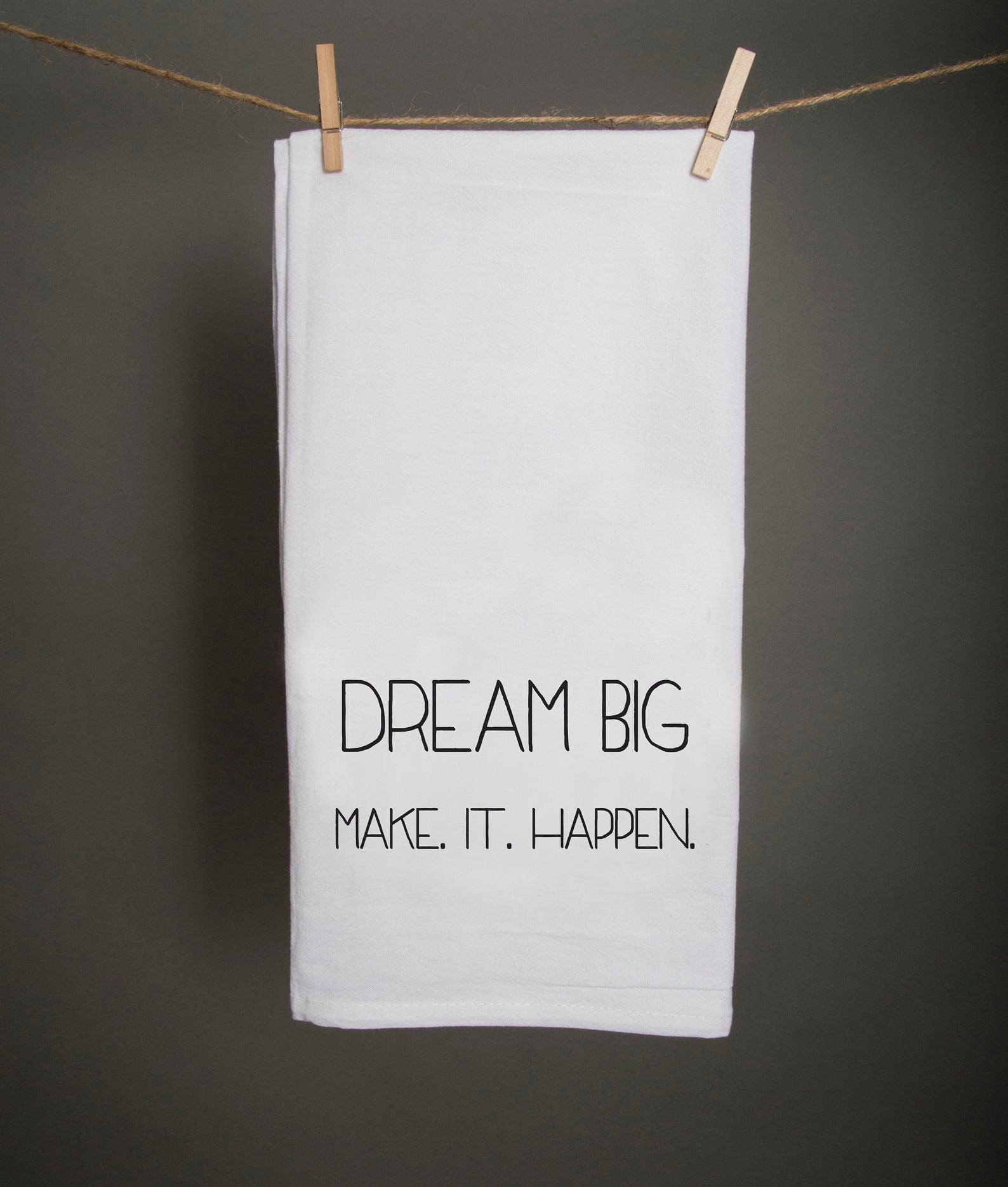 "Dream Big. Make It Happen." Tea Towel is hand screen-printed by me in my home screen printing studio.